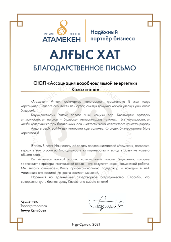 Национальная палата предпринимателей «Атамекен» направила благодарственное письмо Ассоциации возобновляемой энергетики Казахстана